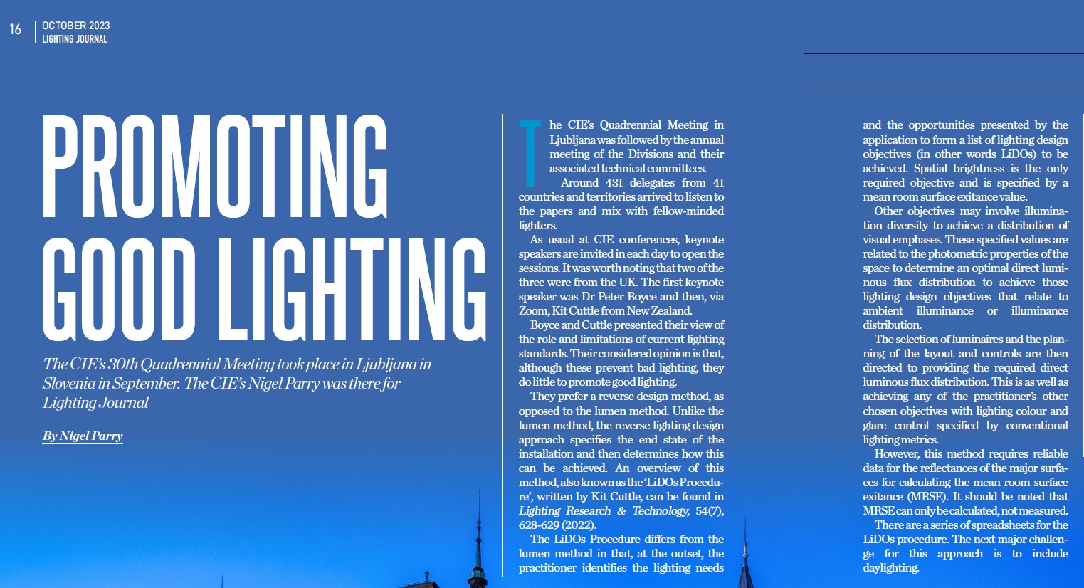 Attending conferences to learn about and discuss the latest research is an essential component of CIE activity. Seventeen members of CIE-UK received support to attend the conference, a value of approximately £20,000. In this article, Nigel Parry describes the discussions he attended at the 30th Session of the CIE, Slovenia, September 2023. This article was originally published in the Lighting Journal, October 2023, reposted here with permission.